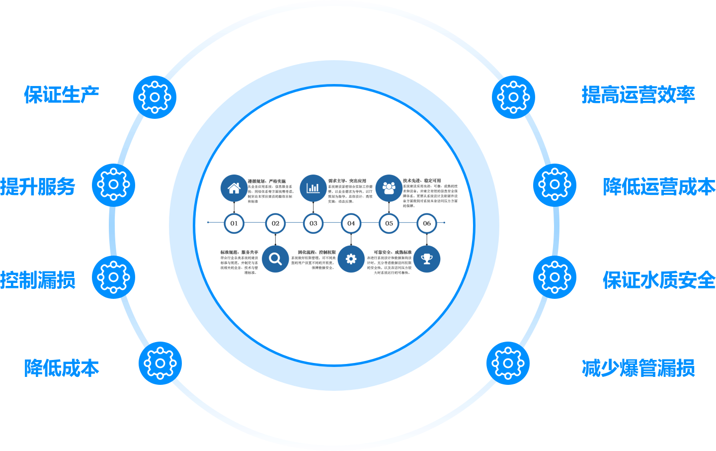 成立及時漏損預警體系,可較著削減漏損預警或事務發明事務;削減檢漏范圍,延長檢漏時候;進步維修效力,削減漏水喪失。